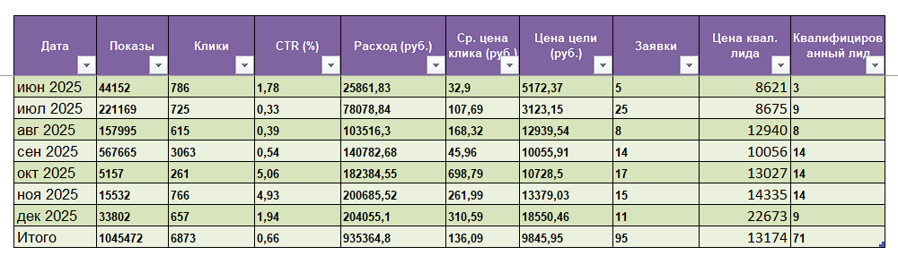 Дальше масштабировал - и вышел на уровень порядка 14 квалифицированных обращений в месяц со средней стоимостью около 12 473 ₽.