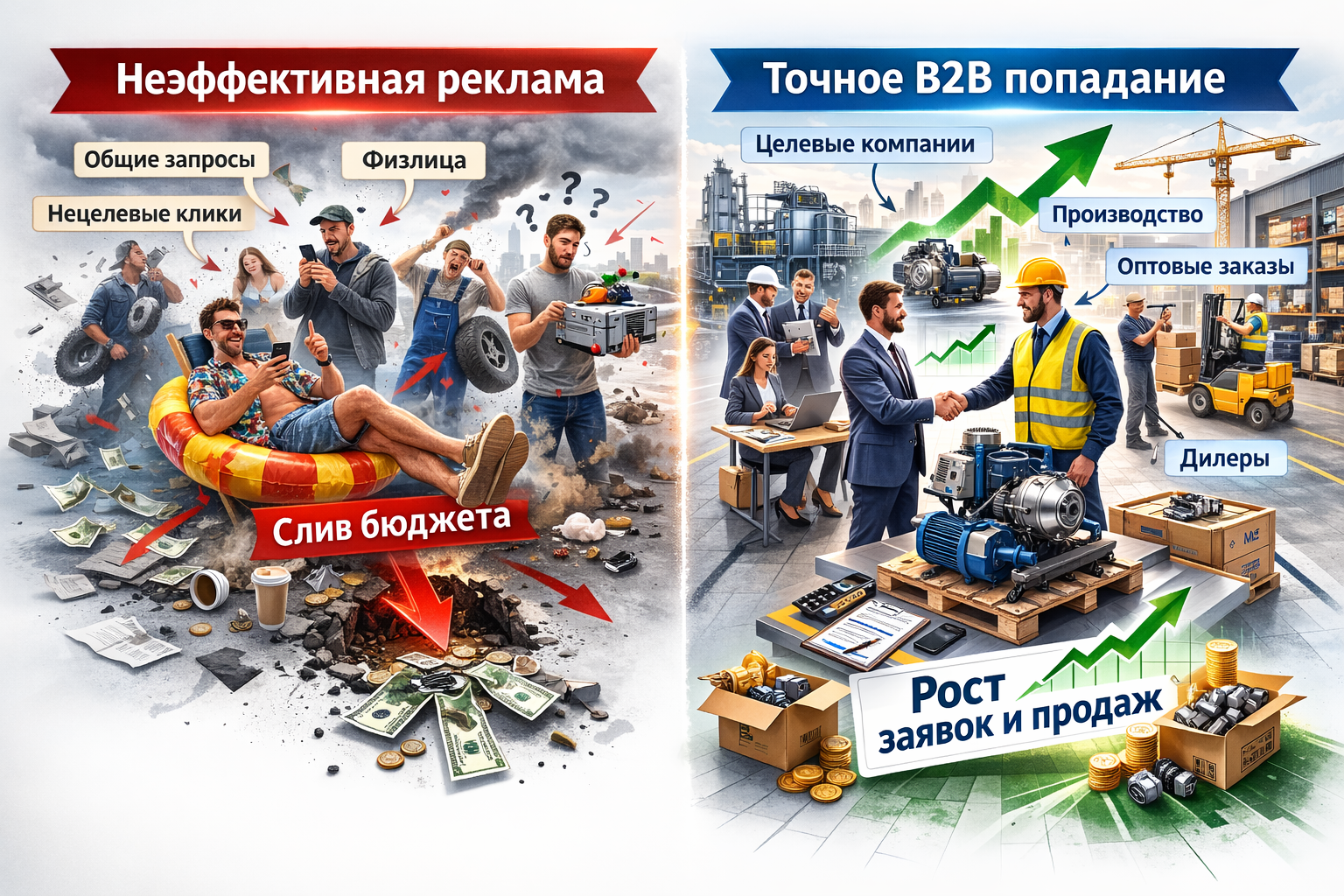 Запускаете Яндекс Директ - и вроде бы есть активность. Только заявки приходят не на тот товар или на слишком маленькие объёмы. Либо вместо компаний на сайт переходят физлица: кликают по общим запросам, видят, что это промышленное B2B-оборудование, и сразу уходят — поэтому по отчётам всё выглядит неплохо, а обращений от бизнеса нет.
